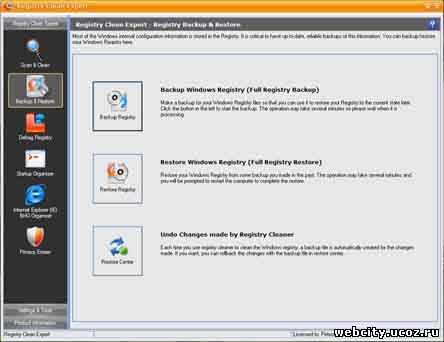 Registry Clean Expert - программа для сканирования реестра на предмет неправильной или устаревшей информации. Благодаря изменению таких данных в реестре система начинает работать быстрее и без ошибок. Программа имеет опцию резервного копирования и восстановления реестра на случай, если система даст сбой. Кроме этого, используя Registry Clean Expert, вы можете управлять приложениями, которые запускаются вместе с Windows и Internet Explorer. Также утилита включает в себя модуль поиска "шпионских" модулей. Имеет интуитивно-понятный интерфейс и работает на платформах Windows Vista, XP, 2003, 2000, ME и Windows 98.